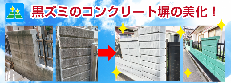 “まちの環境美化”の注目は、黒ズミの“コンクリート塀”です。黒くうす汚れた塀は、街の美観を大いに損ねます。黒ズミは我が家の恥です。家の印象が良くない。家の品格がグッと下がる。家の凶運の兆しです。